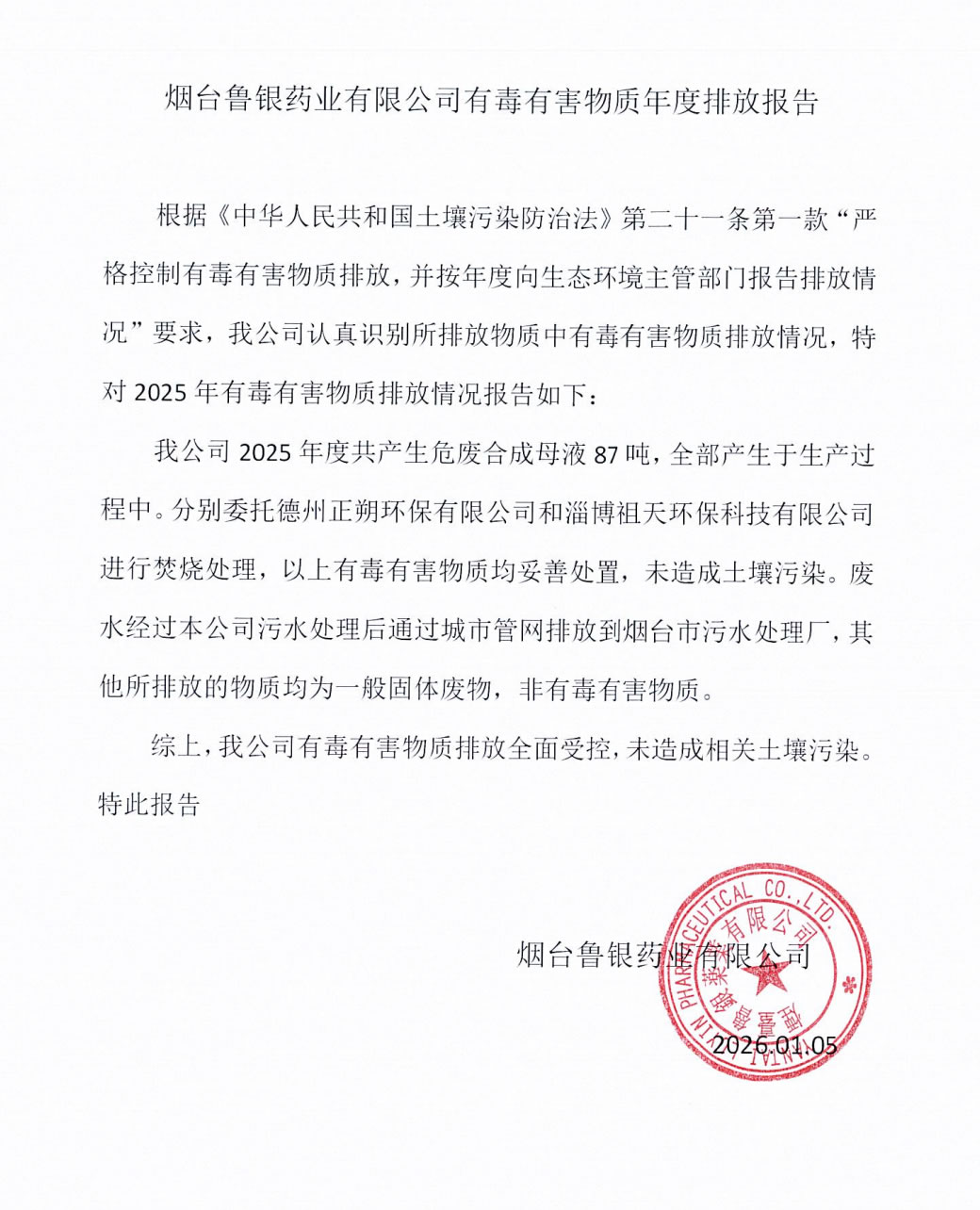 煙臺(tái)魯銀藥業(yè)有限公司有毒有害物質(zhì)年度排放報(bào)告